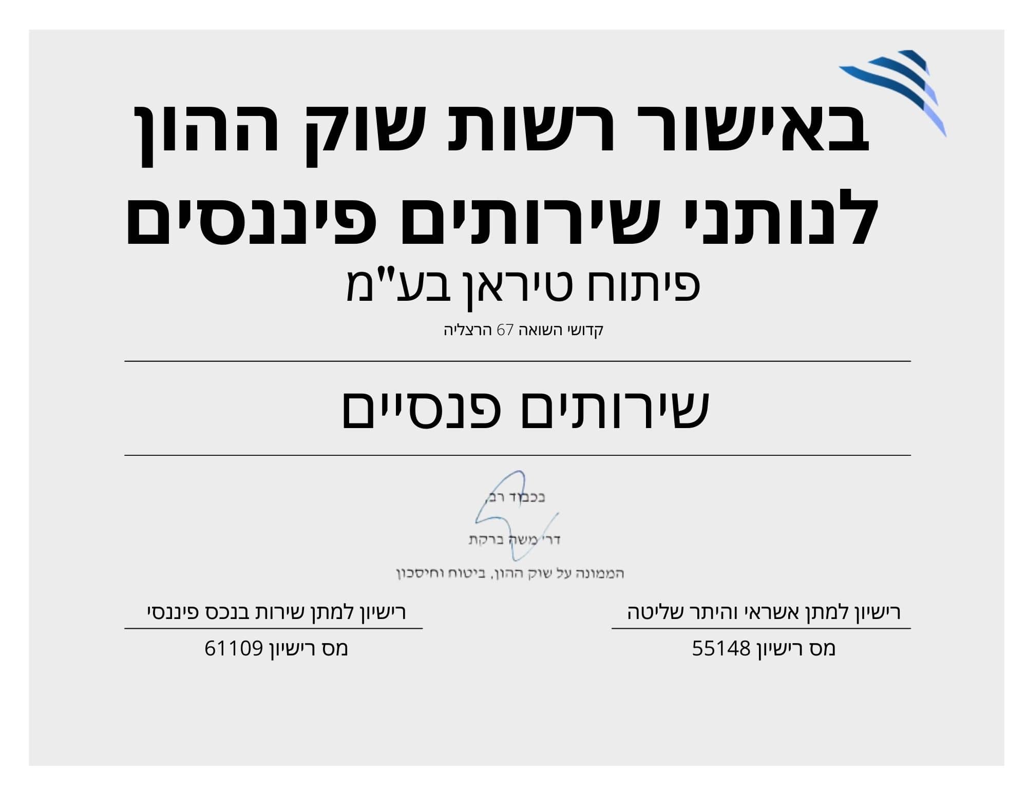 Tiran operates under the supervision of the Capital Market Authority, the Israel Ministry of Finance and under a license for credit granting, license number 55148, as well as a license for the provision of foreign exchange services, license number 61109.